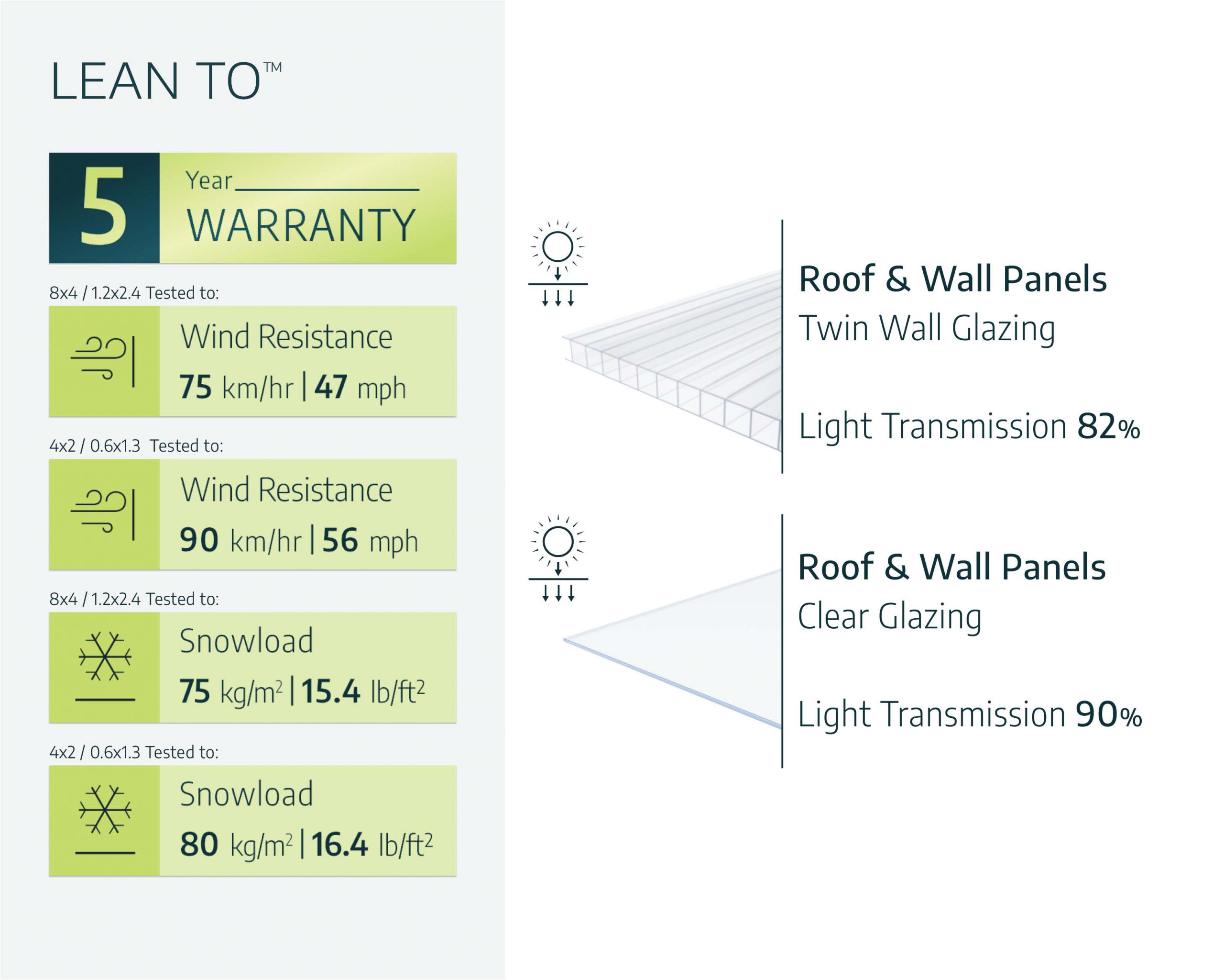 The Lean-to Grow utilizes two types of virtually unbreakable polycarbonate glazing, twin-wall roof panels, and crystal-clear wall panels, for protection from overhead sunlight with plenty of exposure to grow your garden.