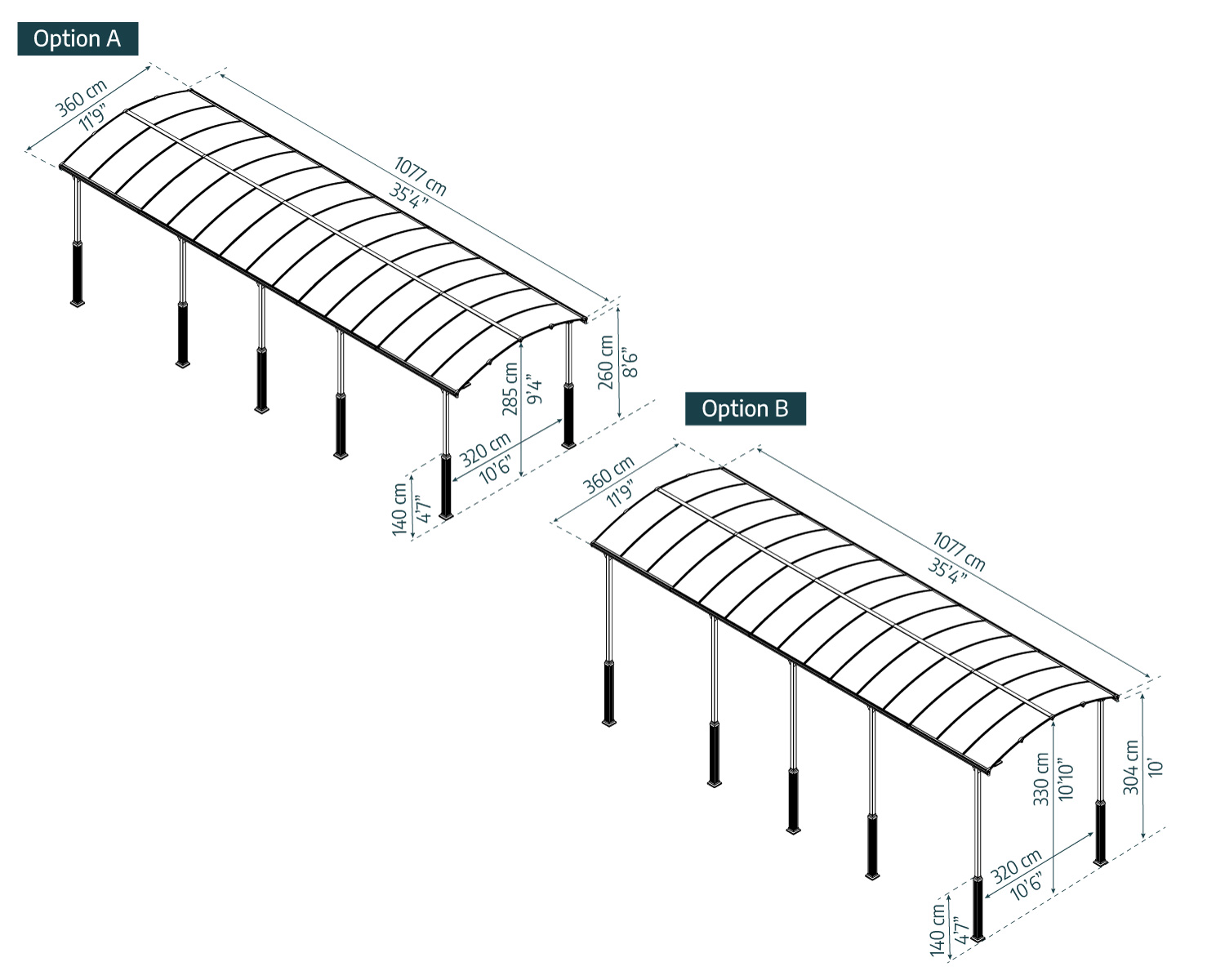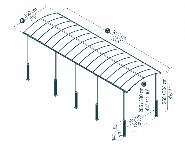 - Maximum carport’s height 11’7″ (352 cm)