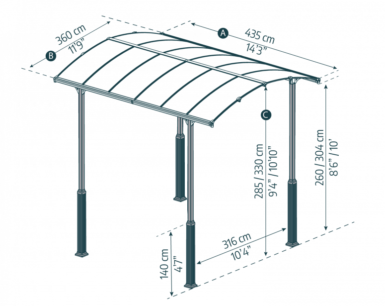 Have an RV or boat you want to protect from the sun and snow? We’ve got you covered. The Alpine RV Carport and Boat Shelter is a high-performance, durable structure designed to withstand the elements and protect your vehicle or boat with ease. The DIY tall carport is height adjustable to fit your needs even if they change over the years. The aluminium Carport protects your vehicle from colour fading from the sun, and unnecessary scratches and damage. With over 10 feet of entry width and 7 feet of overhead clearance, the Alpine RV Carport gives you plenty of room to park and walk around your vehicle. This sturdy single carport also boasts a snow load capacity of up to 20.5 lbs/sq ft. Other features include a gutter to direct rainwater, high-impact twin-wall polycarbonate roof panels, and aluminium and galvanized steel rust-resistant powder coated frame. Extend the life of your boat or RV with the Alpine Carport Kit.