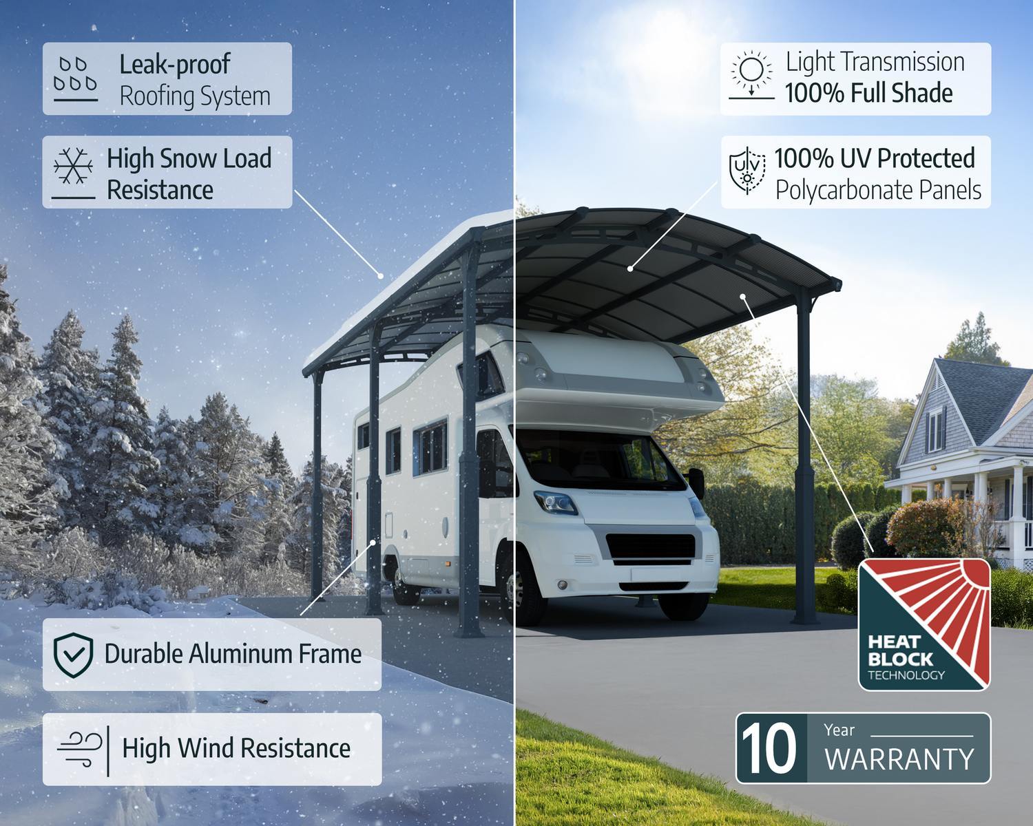 Have an RV or boat you want to protect from the sun and snow? We’ve got you covered. The Alpine RV Carport and Boat Shelter is a high-performance, durable structure designed to withstand the elements and protect your vehicle or boat with ease. The DIY tall carport is height adjustable to fit your needs even if they change over the years. The aluminium Carport protects your vehicle from colour fading from the sun, and unnecessary scratches and damage. With over 10 feet of entry width and 7 feet of overhead clearance, the Alpine RV Carport gives you plenty of room to park and walk around your vehicle. This sturdy single carport also boasts a snow load capacity of up to 20.5 lbs/sq ft. Other features include a gutter to direct rainwater, high-impact twin-wall polycarbonate roof panels, and aluminium and galvanized steel rust-resistant powder coated frame. Extend the life of your boat or RV with the Alpine Carport Kit.