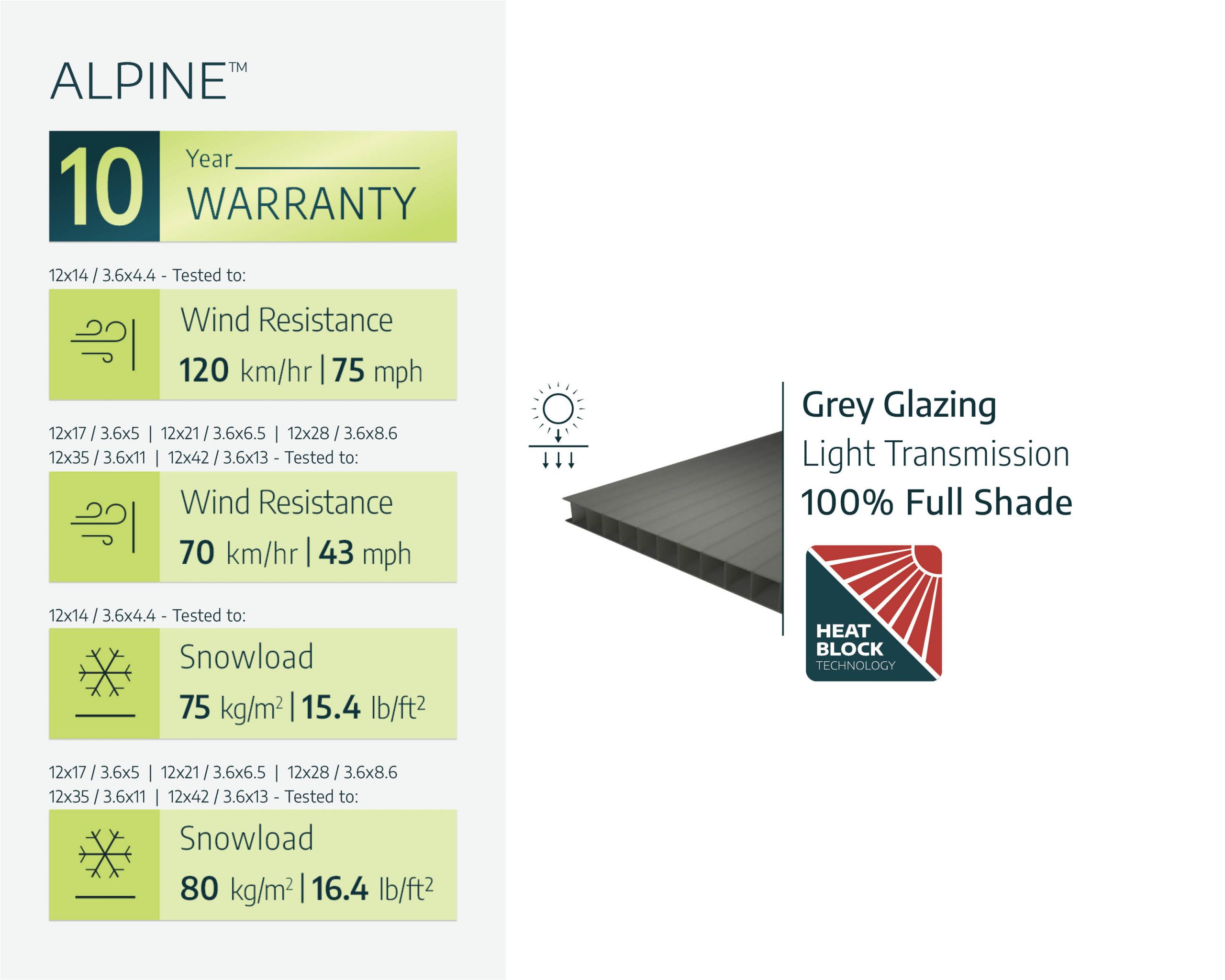 - Virtually unbreakable, Grey-tinted 6 mm twin-wall polycarbonate roof panels allow 15% light transmission.
