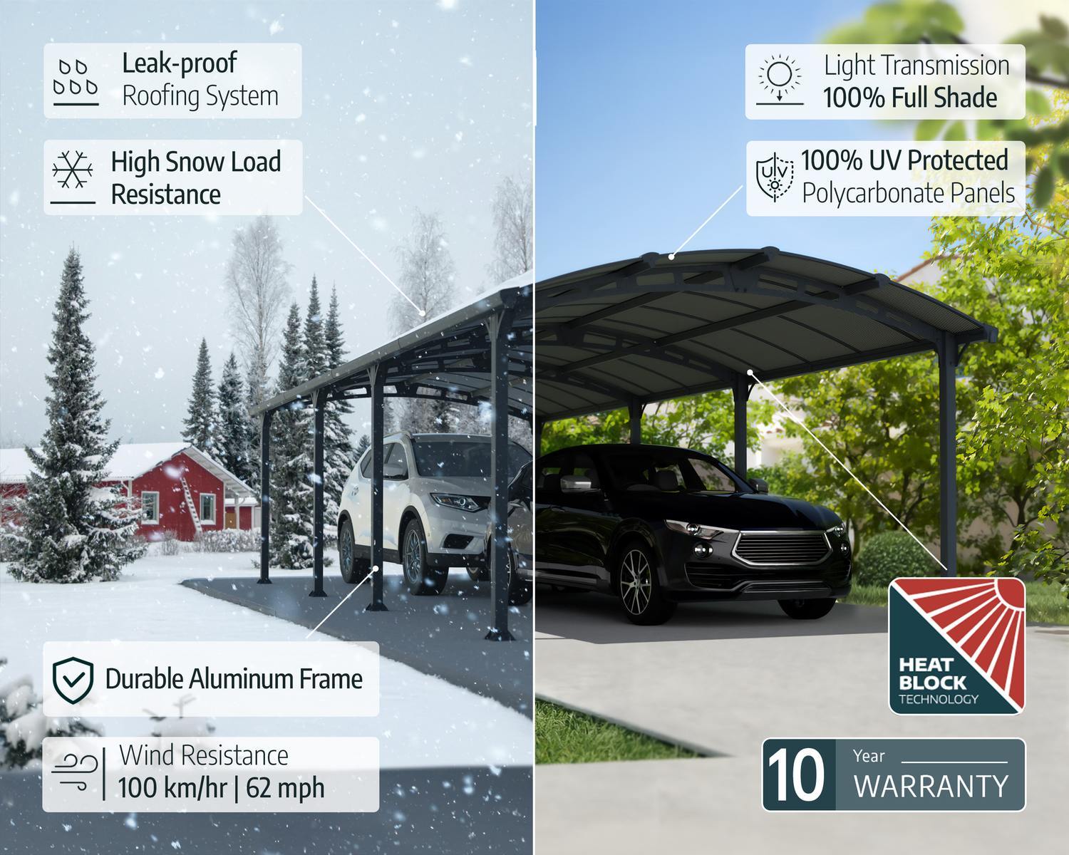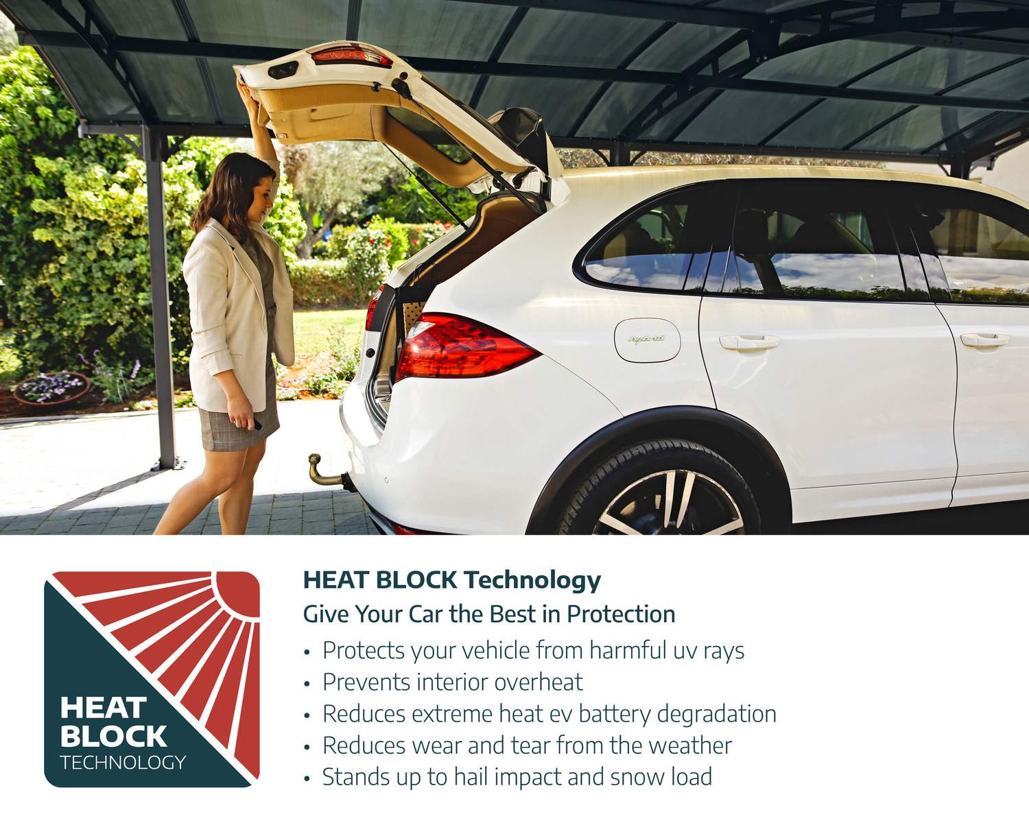 Other features include a gutter to direct rainwater, high impact twin-wall polycarbonate roof panels and an aluminum rust-resistant frame. All these features mean that the structure is multipurpose and can be used as a covered outdoor lounging area as well. Utilizing the unique "Heat Block Technology" the full shade glazing prevents the sun’s rays from shining through making it cooler for an even more enjoyable outdoor experience. Extend the life of your vehicle and spend less time worrying about your car with the Arcadia Carport Kit.