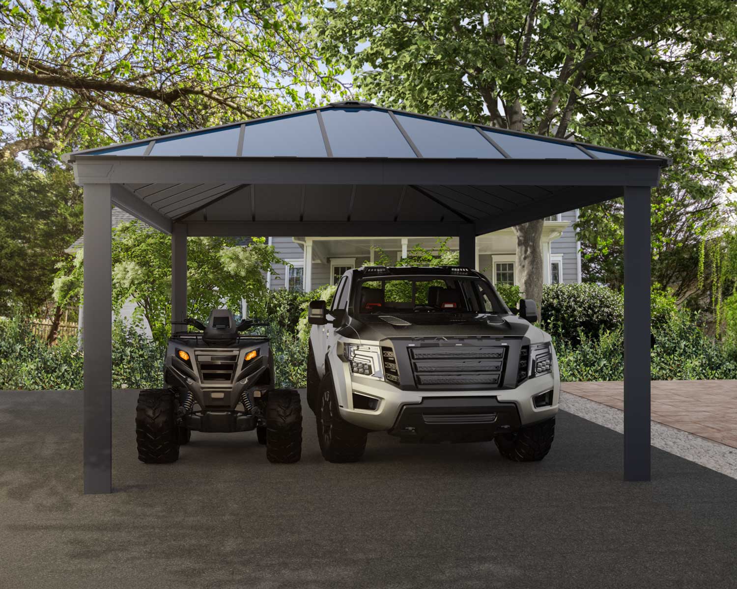 Vehicles are expensive and it’s important to prevent costly repairs and safeguard your investment from rain, snow, and UV-rays. The matte gray polycarbonate roof panels have year-round weather resistance and provide full shade to keep your car cool, preserve the paintwork, and give you peace of mind that your care will be protected from the elements.