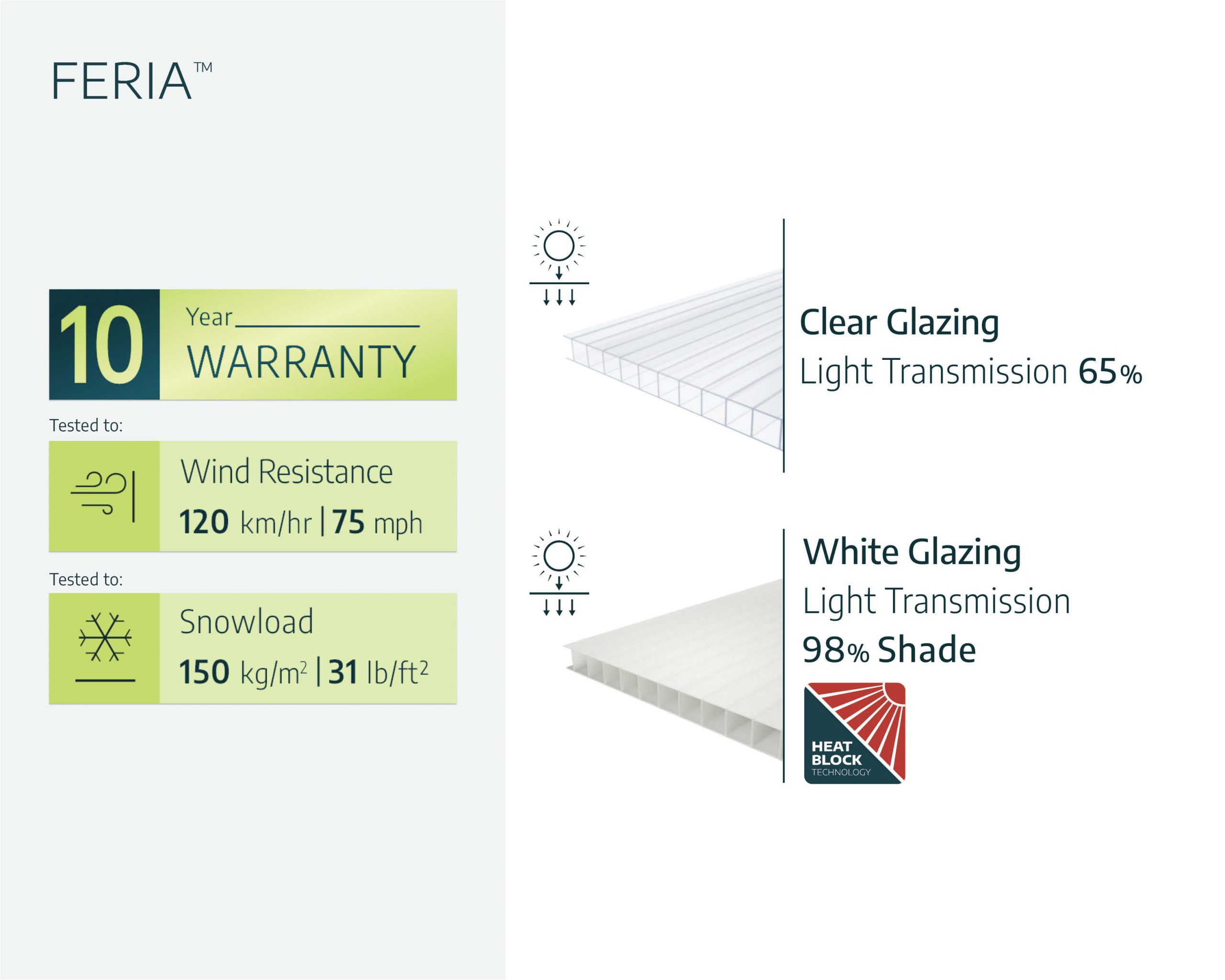 - Life-time resilient polycarbonate glazing; does not fracture, becomes brittle, or turns yellow over time.
