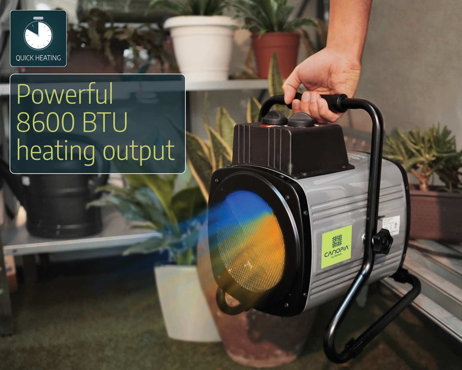 - Largest air output & heating cell in the 1500-W greenhouse heaters (233 m³/h). based on 43W.