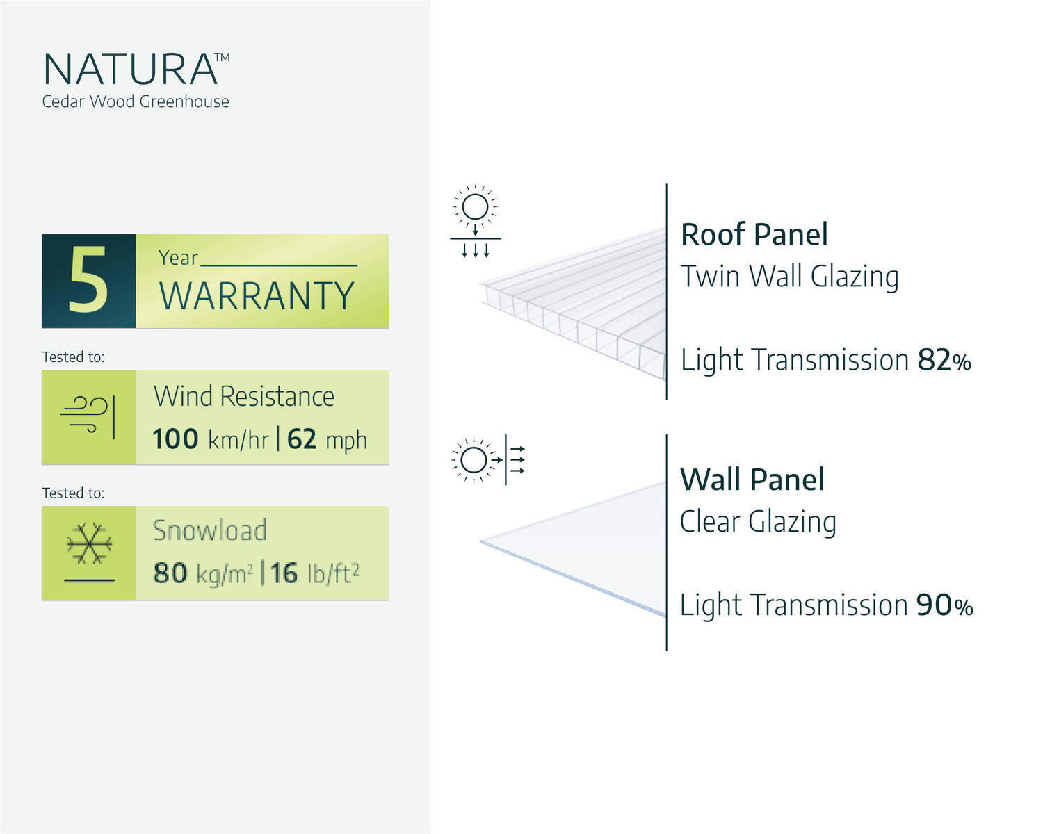 Create a space that’s as functional as it is beautiful with the Natura Cedar Greenhouse. Thoughtfully designed with gardeners and outdoor enthusiasts in mind, it pairs the timeless warmth of cedar with modern materials to give you a durable, purposeful place to grow. Built from naturally resilient cedar wood and UV-protected polycarbonate panels, this greenhouse balances beauty and practicality.
