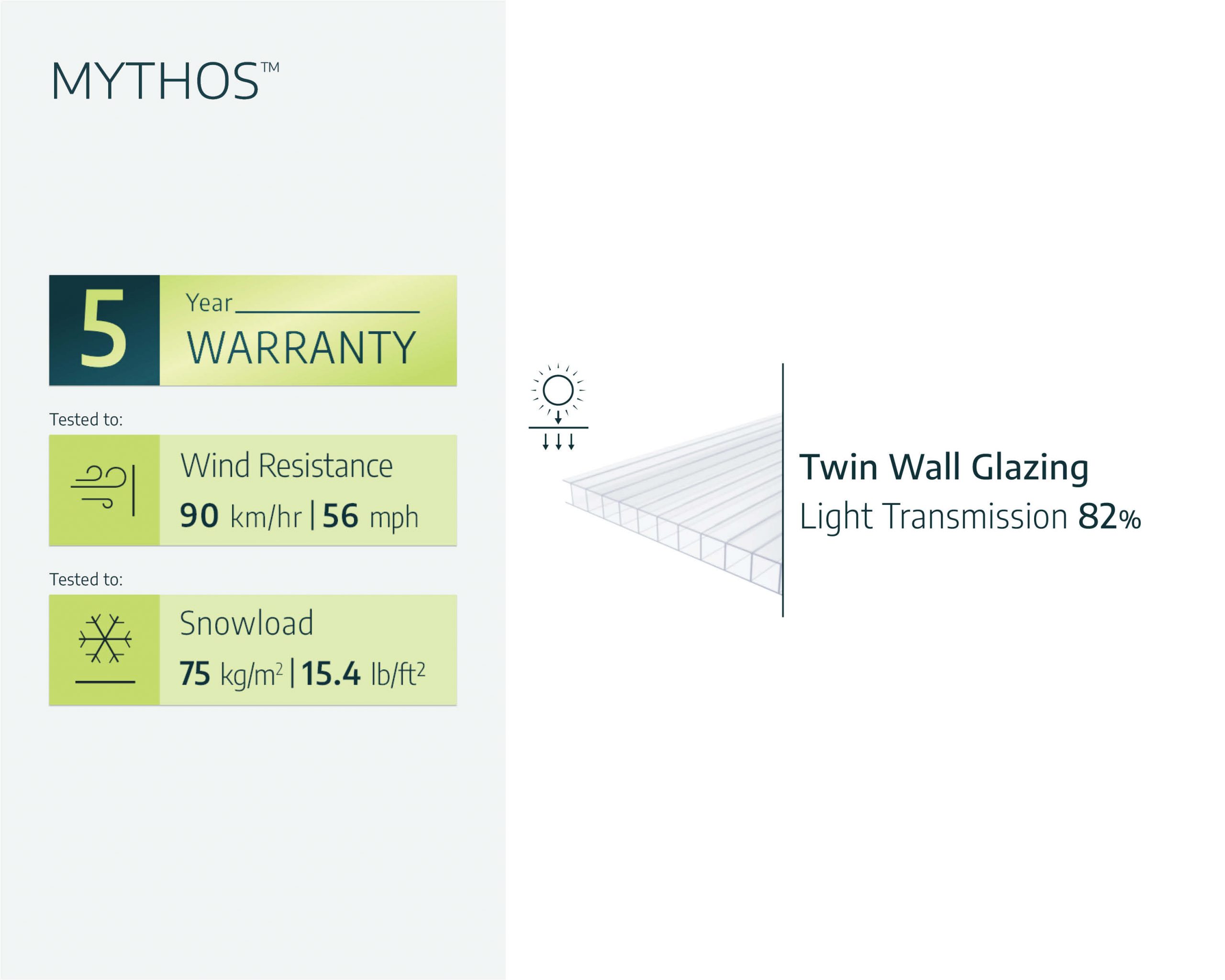 The Mythos wall and roof panels are made of a nearly unbreakable polymer called polycarbonate that has the light transmission benefits of glass but is lighter, stronger, and safer. The double walls diffuse intense sunlight that can stress plants, inhibit growth, and provide twice the heat retention of single panels for a stable environment.