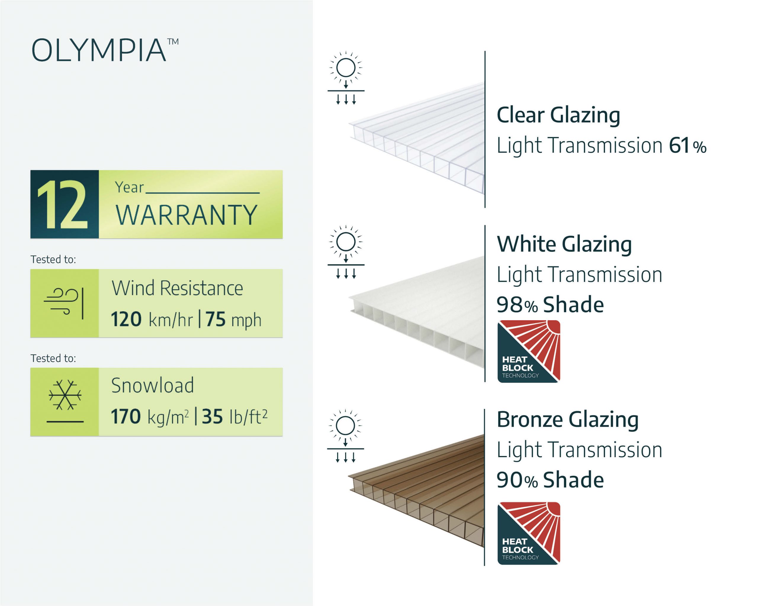 Whether you want an outdoor space to entertain, celebrate special family events or simply relax in your outdoor spa, the Olympia Patio Cover has got you covered. It provides you with an ideal setting to enjoy your garden and de-stress at the end of the day. The Olympia is robust, sturdy, and durable, comprised of heavy-duty, powder coated corrosion resistant aluminium structure and virtually unbreakable, 100% UV protected, light diffusing multi-wall polycarbonate roof panels. Be creative with your new luxurious, Olympian style outdoor lounging space; add some glamour to your garden appeal and turn your outdoor area into an elegant addition to your home and lifestyle to be enjoyed throughout the year.