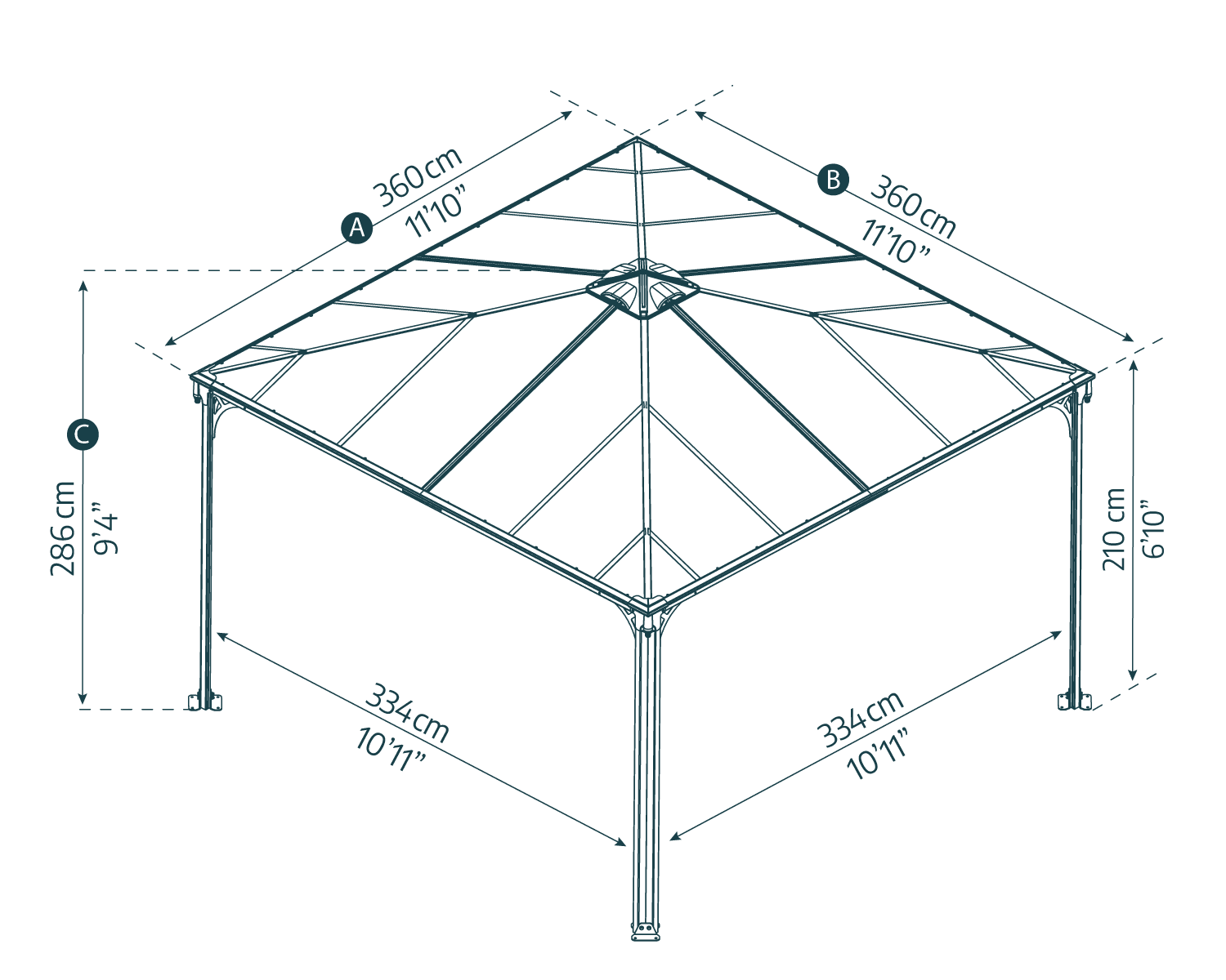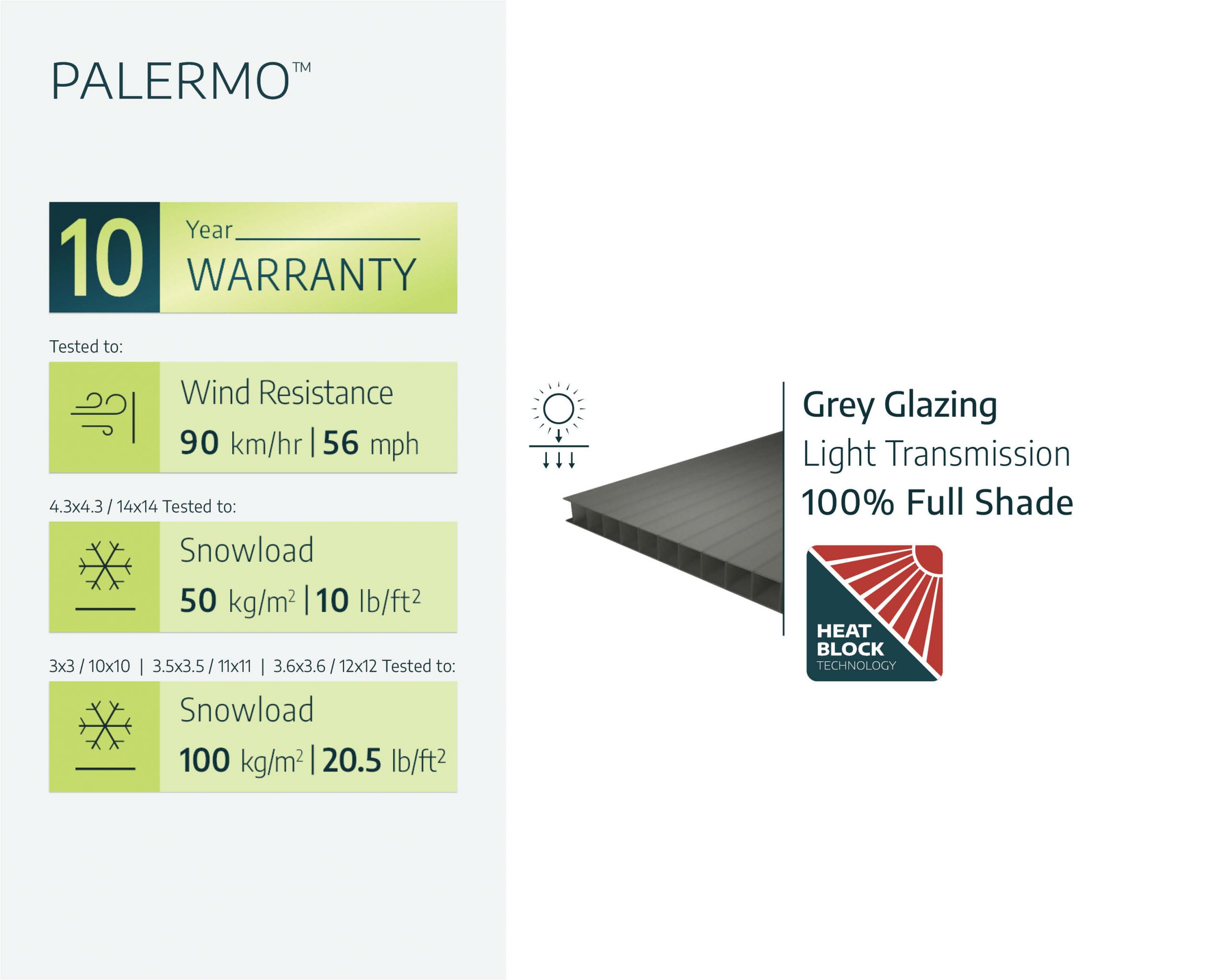 • Year-Round Weather Resistance: Wind, snow, and hail resistant. Tested to withstand winds up to 90 km/hr. for all Palermo sizes. Tested to withstand snow load of 50 kg. /m2 (4.3×4.3m) 100 kg. /m2 (3x3m / 3.5×3.5m / 3.6×3.6m).