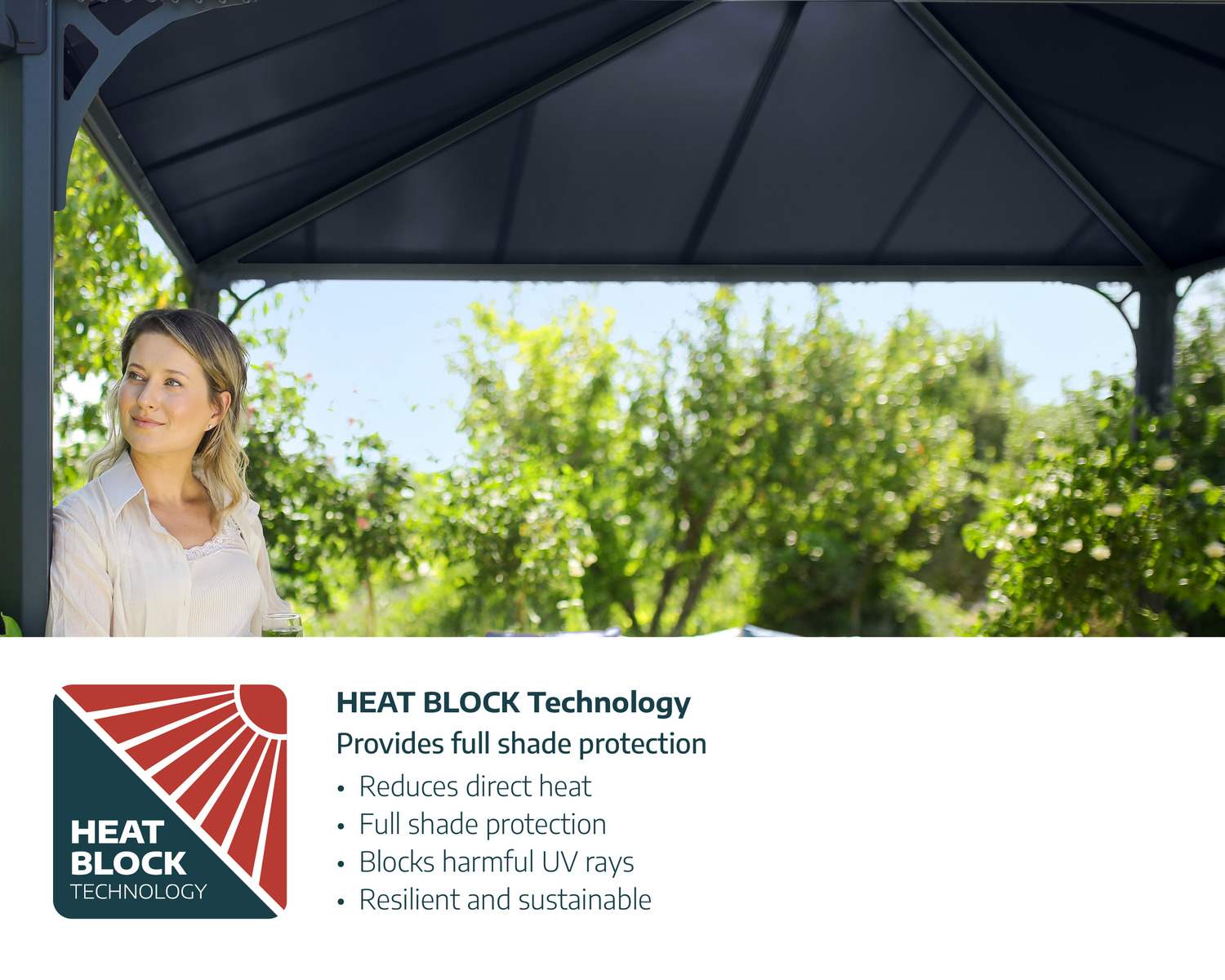 Commune with nature from the comfortable lounging space of your Palermo Garden Gazebo. Perfect for a retreat during the hot days and cool nights of summer, alfresco entertaining, over an outdoor spa, or to simply spend more time comfortably outside. Add some gazebo netting to stay safe from intruding insects and a setvof curtains for a private backyard escape. The Outdoor Gazebo has matte grey panels that are UV protected on both sides. Utilizing the unique "Heat Block Technology" the full shade glazing prevents the sun’s rays from shining through making it cooler for an even more enjoyable outdoor experience. The hardtop gazebo is sturdy, durable and provides you with that extra special something in your yard that keeps you wanting to enjoy it over and over.