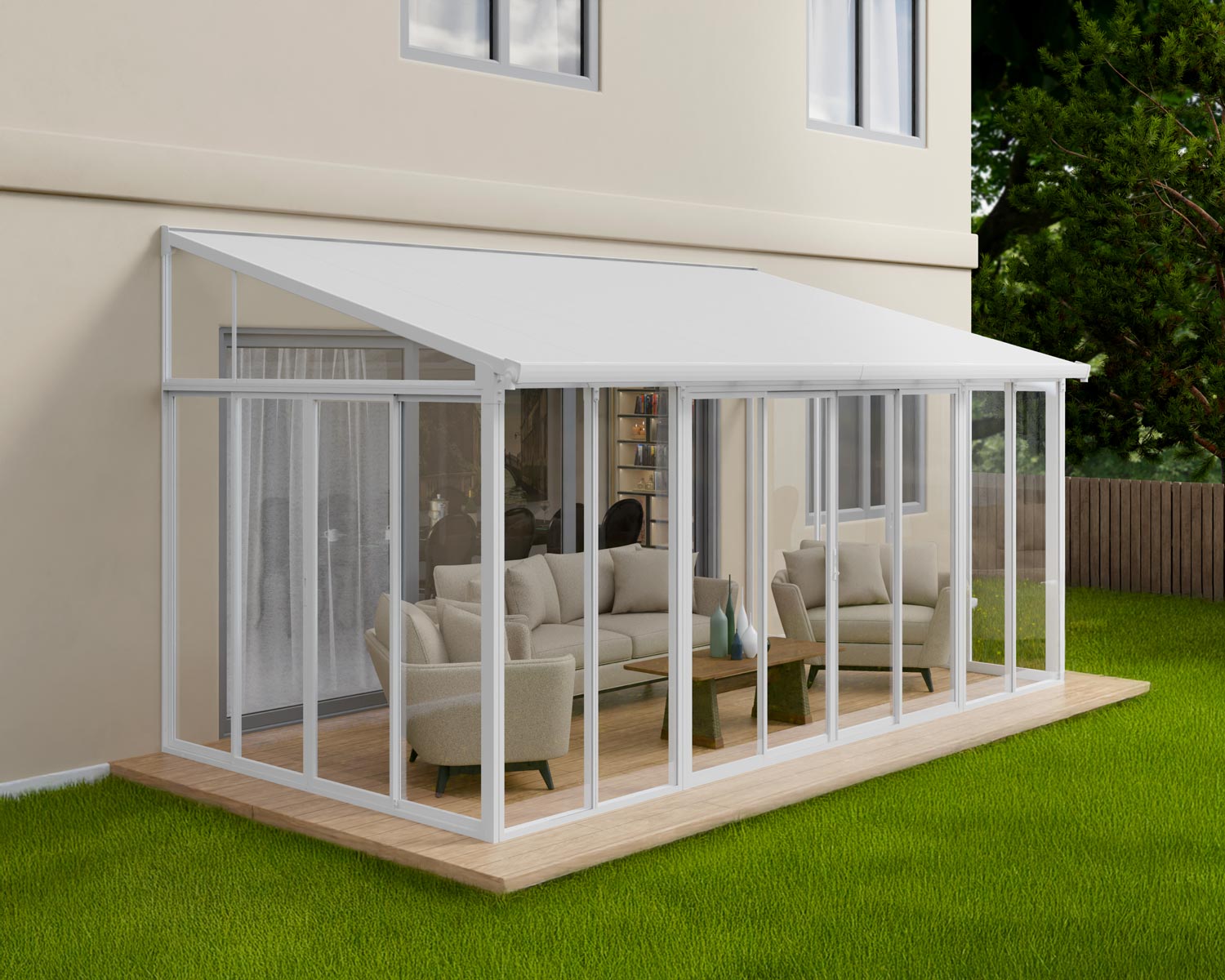 A chic solution that offers the best of indoor-outdoor living, the San Remo Patio Enclosure provides you with a space to enjoy the beauty of the outdoors with interior comforts, no matter the season. Made with 100% recyclable materials, the Sunroom features high impact crystal-clear acrylic wall panels giving you a pristine view of your surroundings. The white or grey powder-coated aluminium frame of the Garden Chalet is reinforced and corrosion-resistant for durability and the screw-free roofing system is specially developed to prevent leaks, making the solarium as functional as it is beautiful. Three lockable double sliding doors (with included master key) safeguard your new space, provide several easy access points, and guarantee your view from every vantage point even when closed. Integrated gutter heads, drainage, and a sturdy aluminium base are included. From stargazing to entertaining, you can do it all in your new year-round indoor-outdoor space. Expand your home and extend your patio use with the San Remo Garden Building.