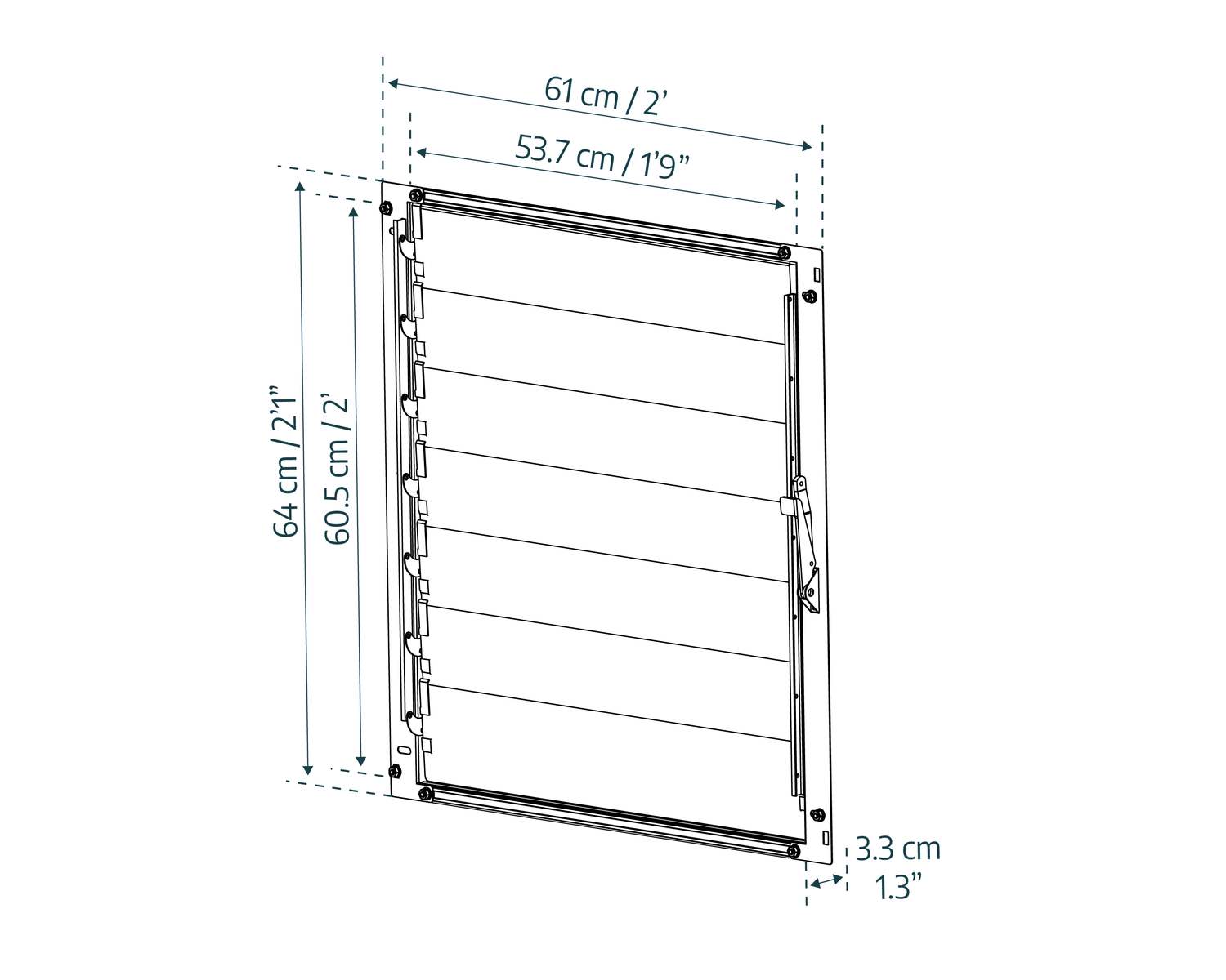 The Side louvre Window was designed to improve the air circulation and help control the temperature in all Palram – Canopia greenhouses. The shutters are controlled manually for variable airflow. When paired with the roof vent, the louvre window can provide improved air circulation. Additionally the Side louvre Window can be fitted with Palram’s Automatic louvre Opener to provide the ideal airflow into the greenhouse.