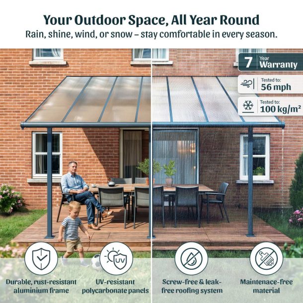 - Safe ultra-durable, polycarbonate patio cover, and multi-functional outdoor structure, designed for superior protection all year-round