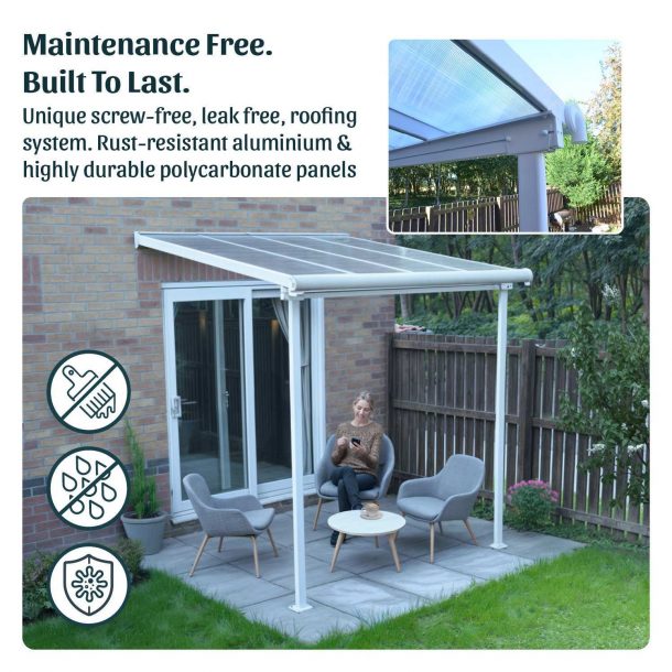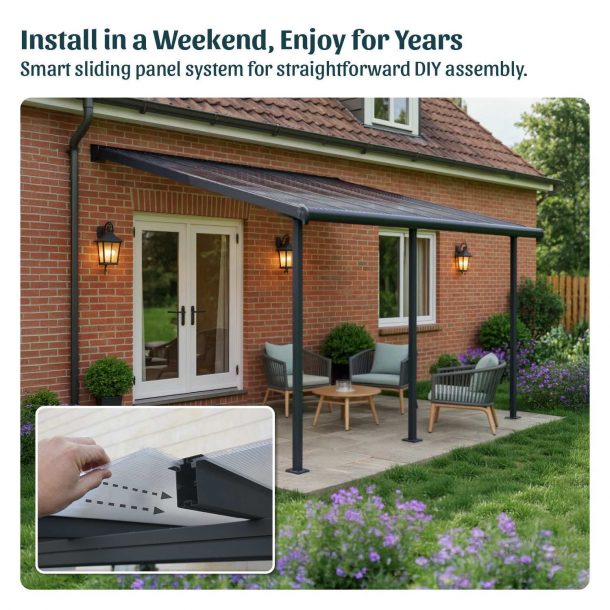 This maintenance-free roofing solution with clear glazing can be used as a patio cover, carport, sun lounge or spa cover, let your imagination run wild. Enjoy family get-togethers and cookouts without the weather ruining your fun. This high-performance structure was designed to be easily assembled by 2 people, using the Safe, quick and easy DIY assembly sliding roofing system that prevents water from penetrating the glazing. The Sierra Patio Cover Kit provides your family with an all-season space that is elegant, sturdy, and rust-free for years to come.