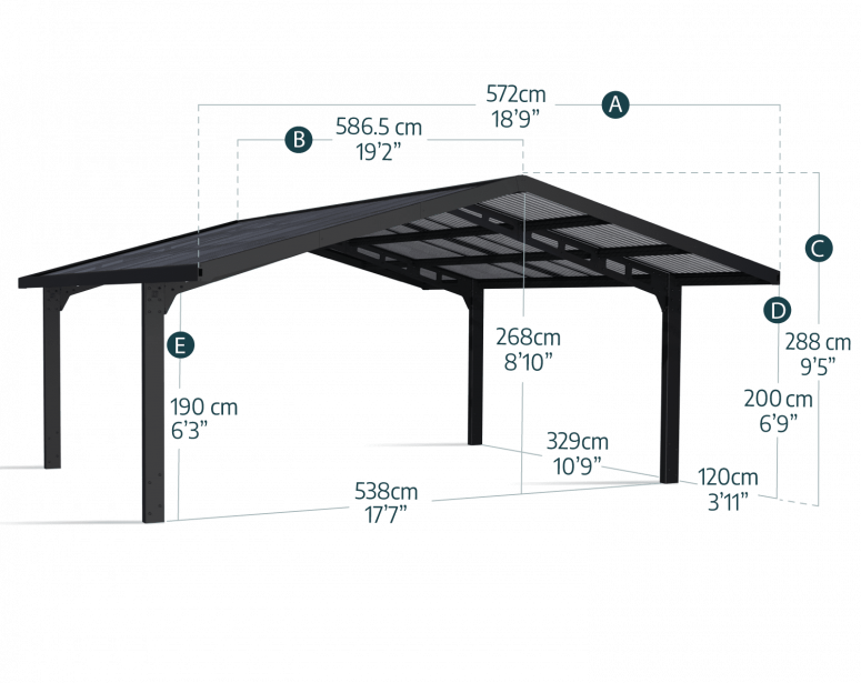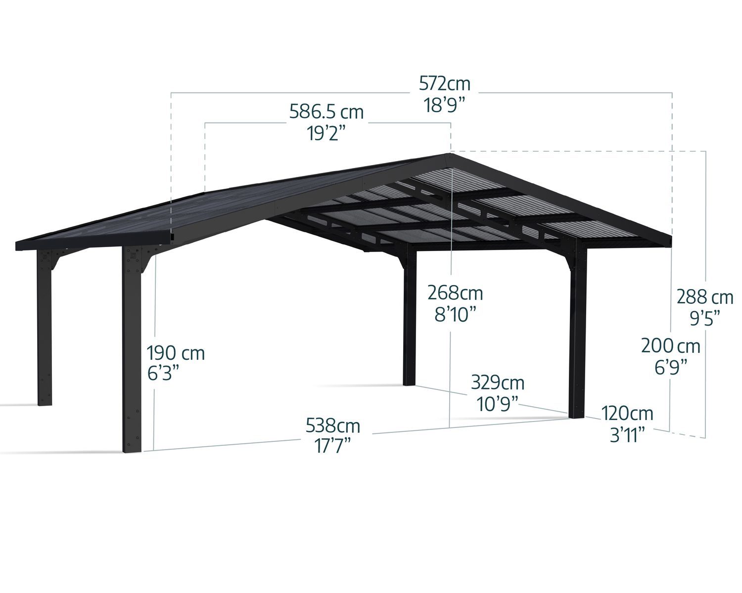 Measuring almost 10 feet wide x 20 feet long, this two-legged car shelter is engineered to withstand volatile weather conditions. The ultra resilient polycarbonate carport includes an internal gutter and is 4 in. wider than competitors. The advantage of the unique design is that the Sydney can be installed as a double carport in an apex or wing shape. Protect your vehicle from snow, hail, wind, and UV-rays in a modern and versatile parking carport.