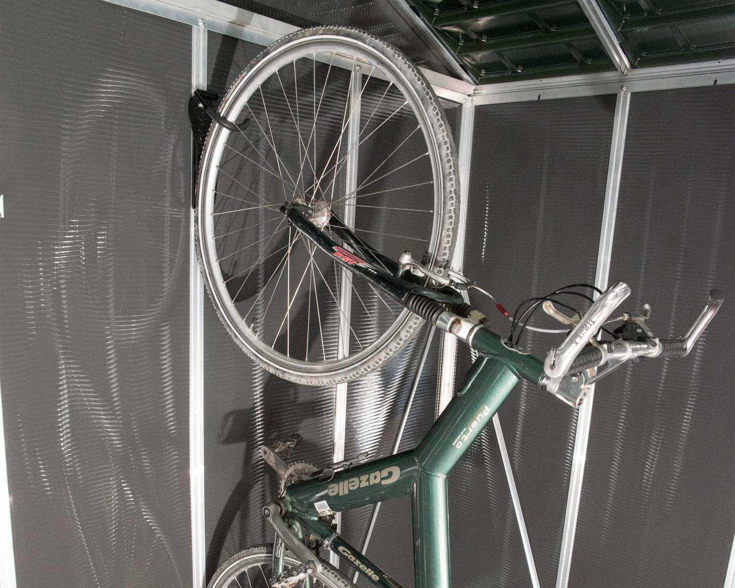 Keep your bike safely stored with the vertical bicycle hanger. Simply hang your front wheel on the rubber-coated hook and rest the rear wheel against the wall for space-saving vertical storage. Very stable black powder coated wall hanger.